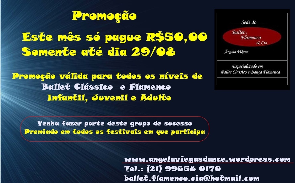 ▫ÂNGELA VIÉGAS ▫ Bailarina Clássica e Flamenca (DRT – 25.272) || Coreógrafa do "Ballet, Flamenco & Cia" || Diretora e Professora do "Ballet, Flamenco & Cia" | Centro de Movimento e Criação || Praticante de Ashtanga Yoga – Contatos: angelaviegasdance@hotmail.com ▫ "BALLET, FLAMENCO & CIA" ▫ Especializado em Ballet Clássico e Dança Flamenca – Contatos: ballet.flamenco.cia@hotmail.com ; Tel.: (21) 99658 0170 – Rio de Janeiro, RJ
