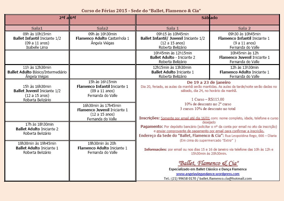 Pagamento: Por depósito bancário (solicitar o nº da conta por email no ato da inscrição) e enviar comprovante de pagamento para: ballet.flamenco.cia@hotmail.com
